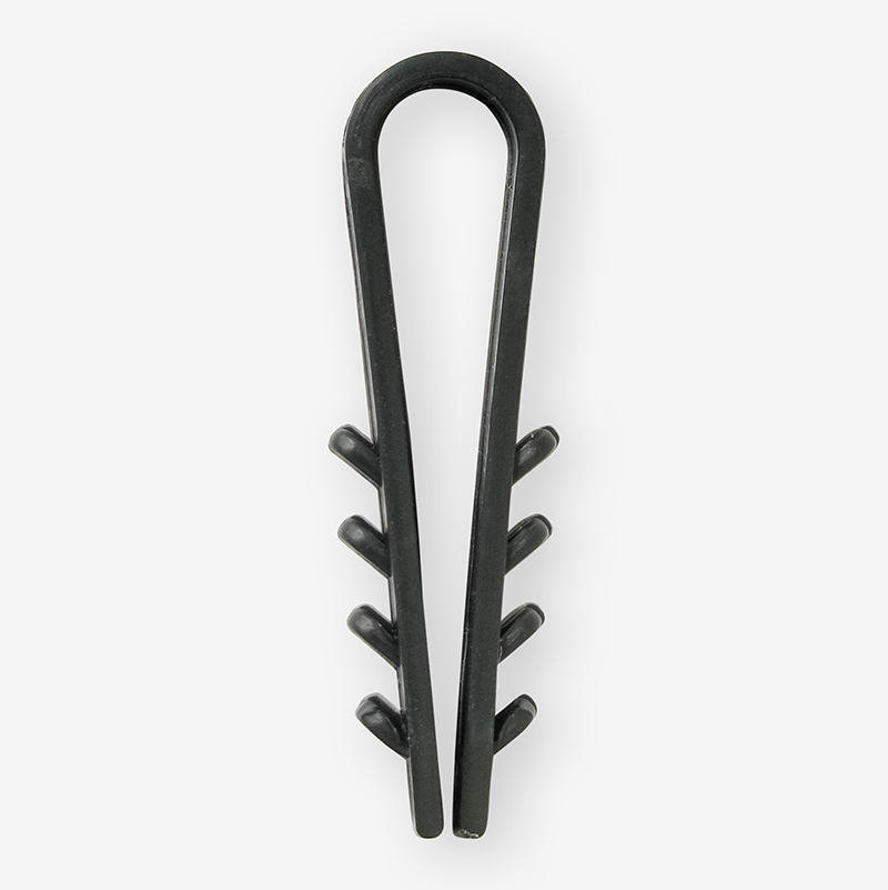 Дюбель-хомут “Ялинка» під круглий кабель Ø 6 чорний є специфічним різновидом пластикового кріплення для протягування кабелю по стелі або стінах (бетон або цегла) у відкритий спосіб. Використовують для фіксації кабелю круглого перерізу діаметром до 6 мм. Продукується з поліпропілену PP A4 і є суцільним виробом, що поєднує у собі функції закладної деталі — дюбеля, та фіксуючої — хомута.