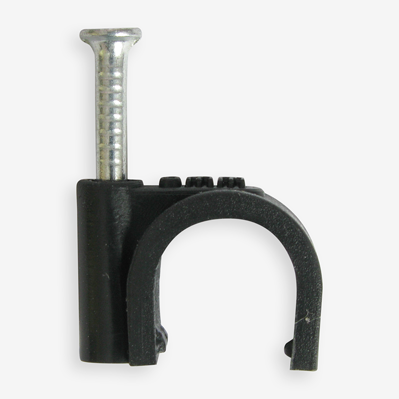 Скоба з цвяхом Ø 8 мм чорна для круглого кабелю Ziplex™ являє собою кріпильний комплект для фіксування та утримання кабелю круглого перерізу діаметром до 8 мм на різних щільних монтажних поверхнях відкритим способом. Скоба, вироблена з полімеру поліпропілену PP A4, є стійкою до появи втомних тріщин, вібраційних навантажень та впливу низьких температур. Цвях з марочної сталі з цинкуванням не підлягає руйнуванню через іржу.