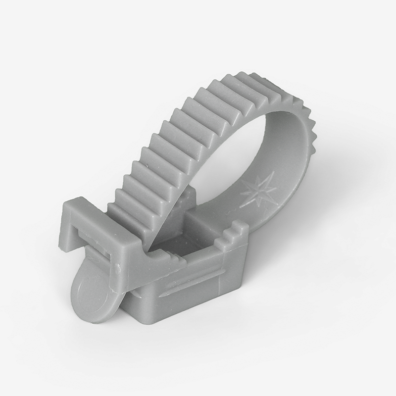 Кріплення ремінцеве КР-25 сіре виробництва Ziplex™ продукують з міцного та стійкого до розтріскування поліетилену. На погляд являє собою широку стрічку з фіксатором та майданчиком з отвором для монтажу виробу на робочу поверхню за допомогою метиза.