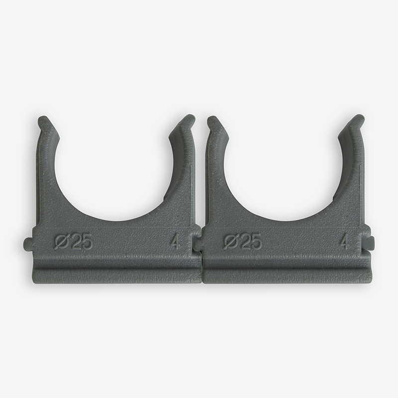 Кліпса для гофротруби Ø 20 сіра Ziplex™ виробляється з поліпропілену PP A4. Підходить для фіксації гофрованих та гладких ПВХ труб з зовнішнім діаметром 25 мм під час монтажу кабельних трас та електромереж різного призначення на горизонтальних та вертикальних поверхнях. Являє собою державку-затискач з ребрами жорсткості для якісної фіксації об’єкту та отвором у її основі для його встановлення на робочу поверхню за допомогою шурупа або дюбеля. Конструкція кріпильних виробів така, що їх можливо поєднувати у блоки, використовуючи передбачені для цього вийми з обох боків затискувача.
