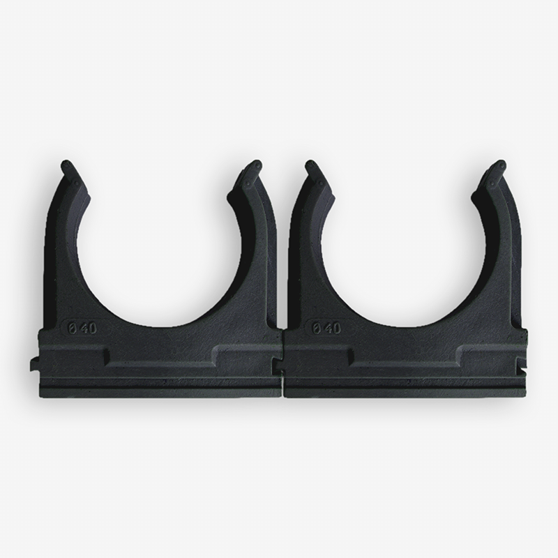 Кліпса для гофротруби Ø 40 чорна Ziplex™ — це пластикове кріплення для монтажу ПВХ труб та відкритого кабелю з зовнішнім діаметром 40 мм. Виробляється з високоякісного поліпропілену PP A4. Стійкий до вібраційних навантажень та перепадам температур. Стійкий до появи втомних тріщин. Не є стійким до УФ випромінювання. Підходить для експлуатації за низьких температур. Надійна фіксація всередині матеріалу забезпечується використанням додаткових елементів кріплення — дюбелів, шурупів, саморізів. Саме для цього у основі конструкції передбачений отвір. Окремі вироби можливо з’єднувати між собою у блоки, користуючись спеціальними виймами з їх зовнішнього боку.