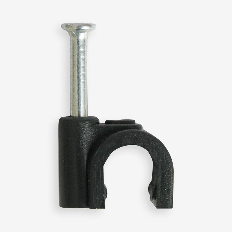Скоба з цвяхом Ø 6 мм чорна для круглого кабелю Ziplex™ — це специфічний в застосуванні різновид пластикового кабельного кріплення. Скоба-гніздечко півкруглої форми комплектується сталевим поцинкованим цвяхом, що не підлягає корозії. Для того, щоб монтувати кабель круглого перерізу діаметром до 6 мм на дерев’яну, гіпсокартонну або обтиньковану поверхню, проводити підготовчі роботи — просвердлювати отвори — не потрібно. Визначившись з тим, як протягнути кабель, потрібно вірно розрахувати кількість кріплень на метр кабелю. Після чого, зафіксувавши кабель в скобі, забити кріплення молотком. За такого способу монтажу контролювати цілісність ізоляції кабелю і коригувати рівень його притикання до стіни досить просто.
