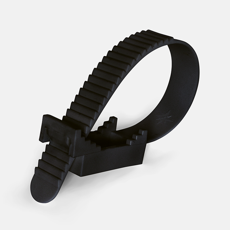 Кріплення ремінцеве КР-40 чорне Ziplex™ продукують з поліетилену HDPE 277, що має високі характеристики міцності. Призначене для фіксування труб та кабелю на різні монтажні поверхні за допомогою метиза, отвір для якого передбачено в монтажному майданчику. На погляд та за способом фіксації робочої петлі воно схоже на кабельний хомут, проте витримує геть більші навантаження.